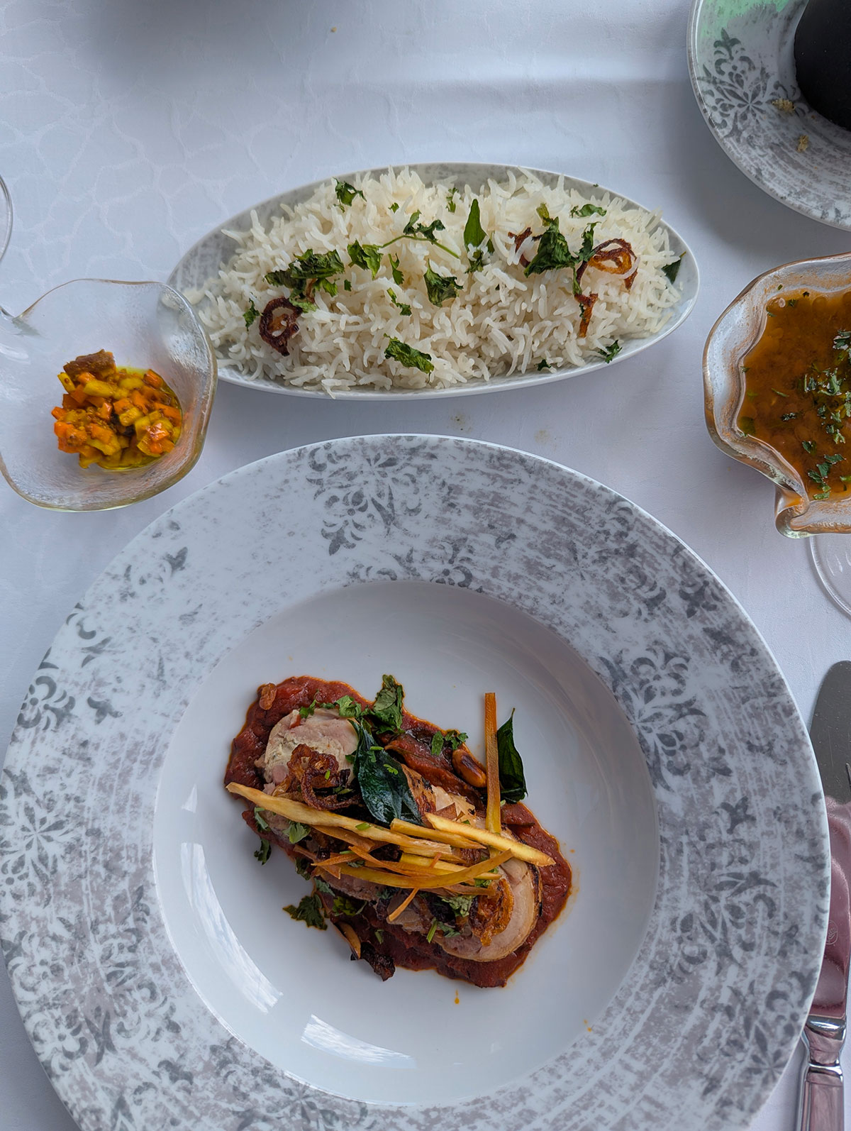 L'alternative proposée illustre sa curiosité permanente : une rougaille Boucané de volaille et saucisse créole fumée. Longtemps, le boucané est resté associé au porc et aux saucisses traditionnelles, mais le chef a souhaité explorer la version volaille, sur le même principe de fumage et de salaison. C'est lors d'un séjour à La Réunion, il y a une dizaine de mois, qu'il découvre ce produit et décide de l'adapter à sa façon. Pas question toutefois de "copier-coller" : aux épices réunionnaises, il oppose celles de Maurice, revendiquant une signature bien distincte. Les épices envoûtantes des îles rencontrent ici une fricassée de lentilles et un riz basmati délicatement parfumé à la cardamome, où le masala apporte cette liaison généreuse au curry typiquement mauricienne.