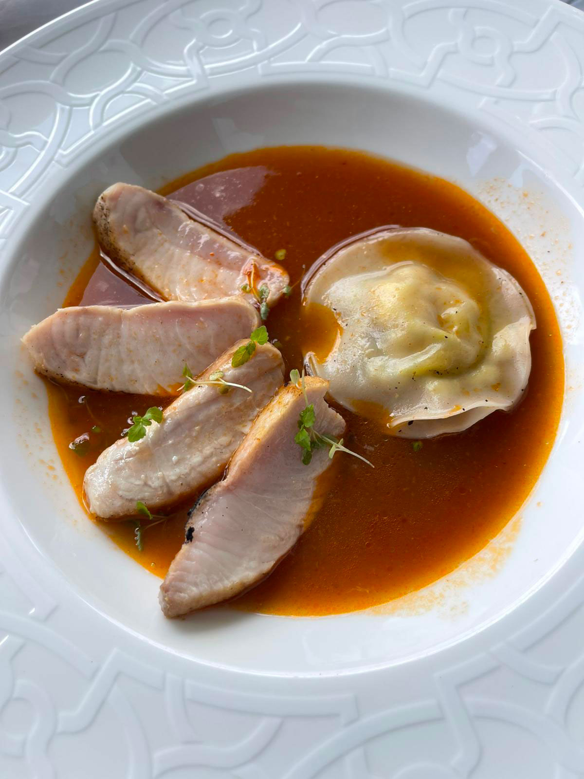 Le plat principal témoigne de sa philosophie anti-gaspillage. Pour son poisson du lagon délicatement snacké, le chef récupère absolument tout : les arêtes et la tête servent de base à une soupe parfumée, tandis que les dernières fibres encore accrochées aux arêtes permettent de confectionner de fins raviolis farcis. Sublimé par un aïoli parfumé au safran et un pain grillé au beurre d'ail, ce plat incarne à merveille l'image du bouillon de poisson servi avec du pain à la maison, réinterprété avec un visage contemporain et élégant.