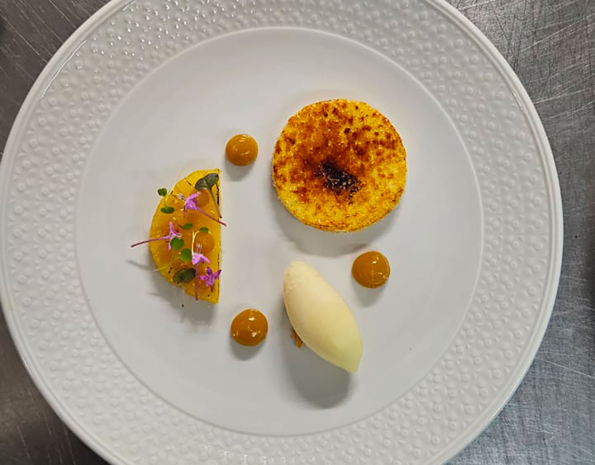 Le dessert, baptisé "Ananas Découvert", constitue l’autre apothéose de ce voyage gustatif. Le chef pâtissier explique sa démarche : "Nous travaillons l'ananas Victoria, ce fruit d'origine d'Agria naturellement très sucré, que nous accompagnons d'un sorbet maison fraîchement préparé, légèrement salé pour créer un contraste. La crème brûlée apporte la douceur nécessaire à l'équilibre, tandis qu'une mayonnaise au fruit de la passion vient rehausser l'ensemble." Explique le chef pâtissier Steven Allagen. Cette construction savante illustre une maîtrise technique où chaque élément joue sa partition dans une harmonie de saveurs oscillant entre sucré, salé et acidulé.