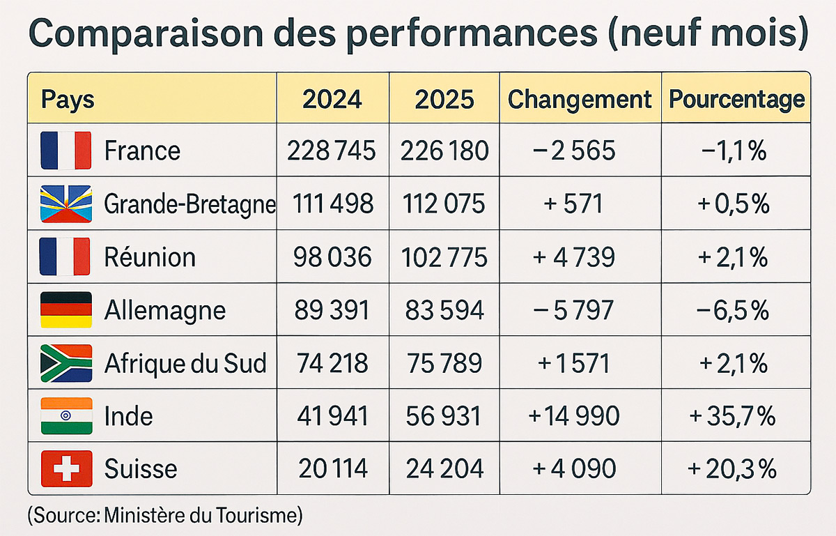 L'analyse comparative des performances montre que Maurice parvient à maintenir sa position sur un marché touristique régional en pleine recomposition. Les hausses significatives enregistrées sur plusieurs marchés sources témoignent d'une image positive de la destination et d'une capacité à attirer une clientèle internationale diversifiée.