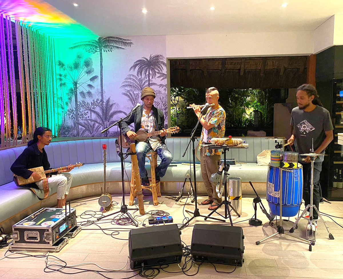 Un groupe de quatre jeunes musiciens ont présenté un spectacle aux clients en utilisant des instruments fabriqués à partir de « matériaux recyclés », tout en détaillant les objets employés.