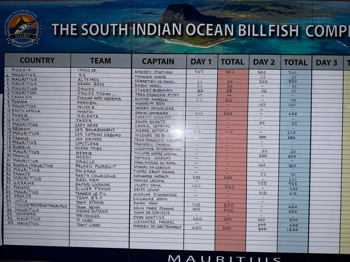 Au classement par équipage, TIGHT LINES, sous la houlette du capitaine Frédéric de Chasteauneuf, caracole en tête avec 1 200 points, fruit d'une stratégie aussi audacieuse qu'efficace. La Team REEL MEN de Damien Lagesse suit à distance respectable avec 958 points, tandis qu'ALTEMOS, que pilote Sébastien de Ravel, complète ce triptyque mauricien en affichant 850 points au compteur.