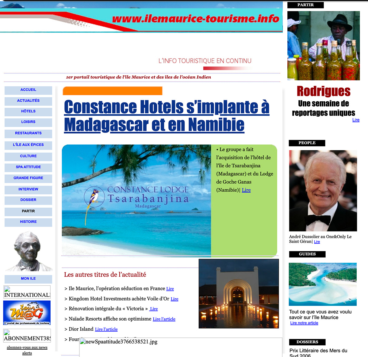 Hôtellerie : expansion & excellence• Constance Hotels fait parler,de lui, élargissant sa présence à Madagascar (Tsarabanjina) et en Namibie (Goche Ganas), lançant les concepts "Constance Island Lodge" et "Constance Safari Lodge". Le groupe mise sur la discrétion et le haut de gamme. Essentiel à retenir : "Une île soi", entre détente totale, nature préservée et authenticité.