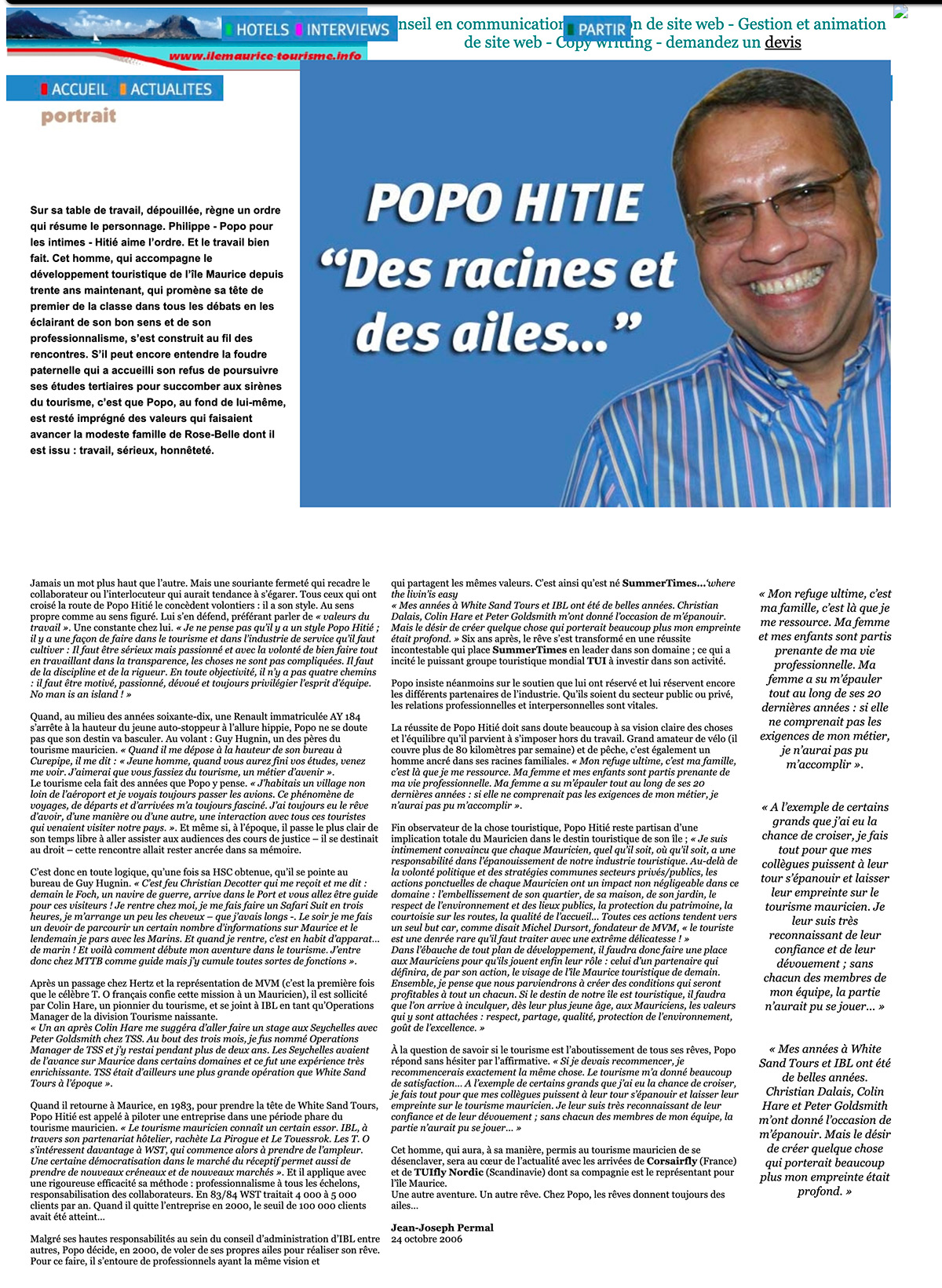 Portrait de Popo Hitié : des racines et des ailesPhilippe Popo, dit Popo Hitié, est l’une des grandes figures du tourisme mauricien. Issu d’une famille modeste de Rose-Belle, il se forge dès les années 1970 une solide réputation d’homme rigoureux, passionné, attaché à l’excellence et à l’esprit d’équipe. D’abord guide pour MTTB, puis successivement pilier du développement du réceptif chez Hertz et IBL, il devient l’un des rares Mauriciens à diriger d’importantes opérations touristiques. Après avoir marqué White Sand Tours d’une empreinte durable (plus de 100 000 clients en 2000), il fonde SummerTimes, couronnée de succès et d’un partenariat avec TUI. Grand amateur de vélo, défenseur de valeurs humaines fortes, Popo prône un tourisme participatif et une implication de chaque Mauricien dans l’accueil et la réussite du secteur. No man is an island ! Son aventure incarne la maturité et l’ambition d’un secteur devenu clé pour l’île. Portrait réalisé par Jean-Joseph Permal